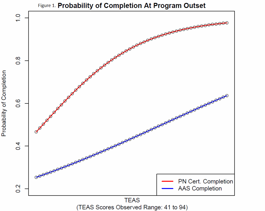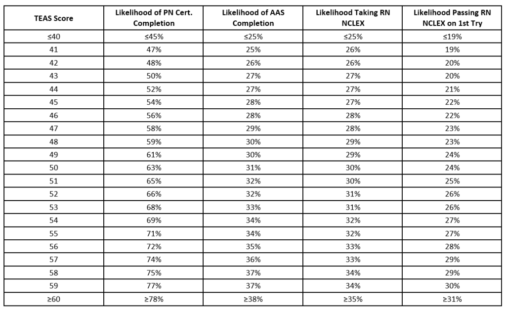 - TEAS score is a good predictor of completion of the Practical Nursing Certificate. It is also a statistically reliable (and decent) predictor of completion of the program’s Associate in Applied Science. See Figure 1.