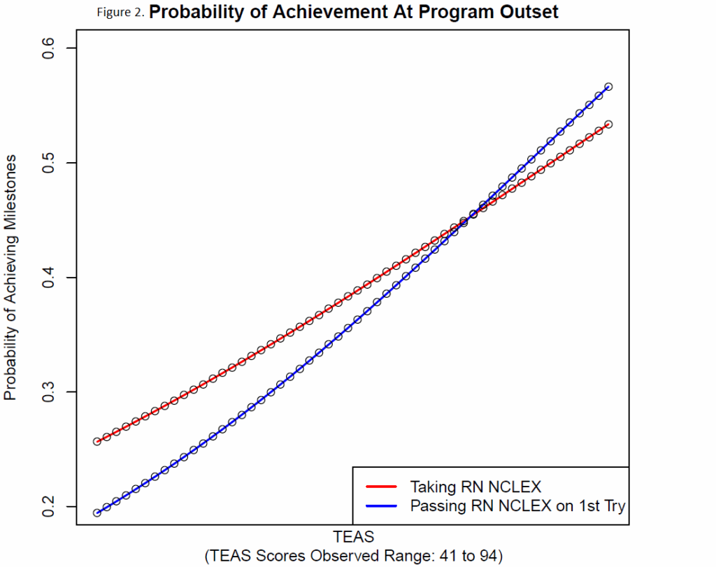 When prospective students apply to the multi-campus Dakota Nursing Program, TEAS scores can be used in admissions decisions. It is helpful to know an applicant’s likelihood of success before accepting or rejecting the applicant, and TEAS scores are considered predictive of nursing student success. Julie Traynor realized, however, that it was not clear what might be an ideal “cut score” where students below the score are rejected and students above the score are accepted. She figured (correctly) that we could provide the kind of evidence needed to support such a determination.